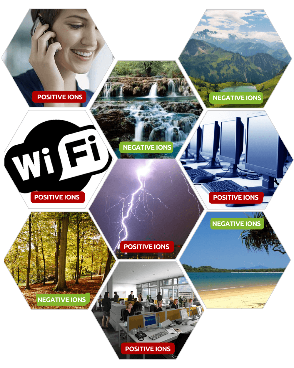 The biggest cause of Positive Ion (the bad ones) generation in our world today is mobile phones, wifi, and electrical devices. Positive Ions, cause stress related issues, like migraine, anxiety and tiredness.