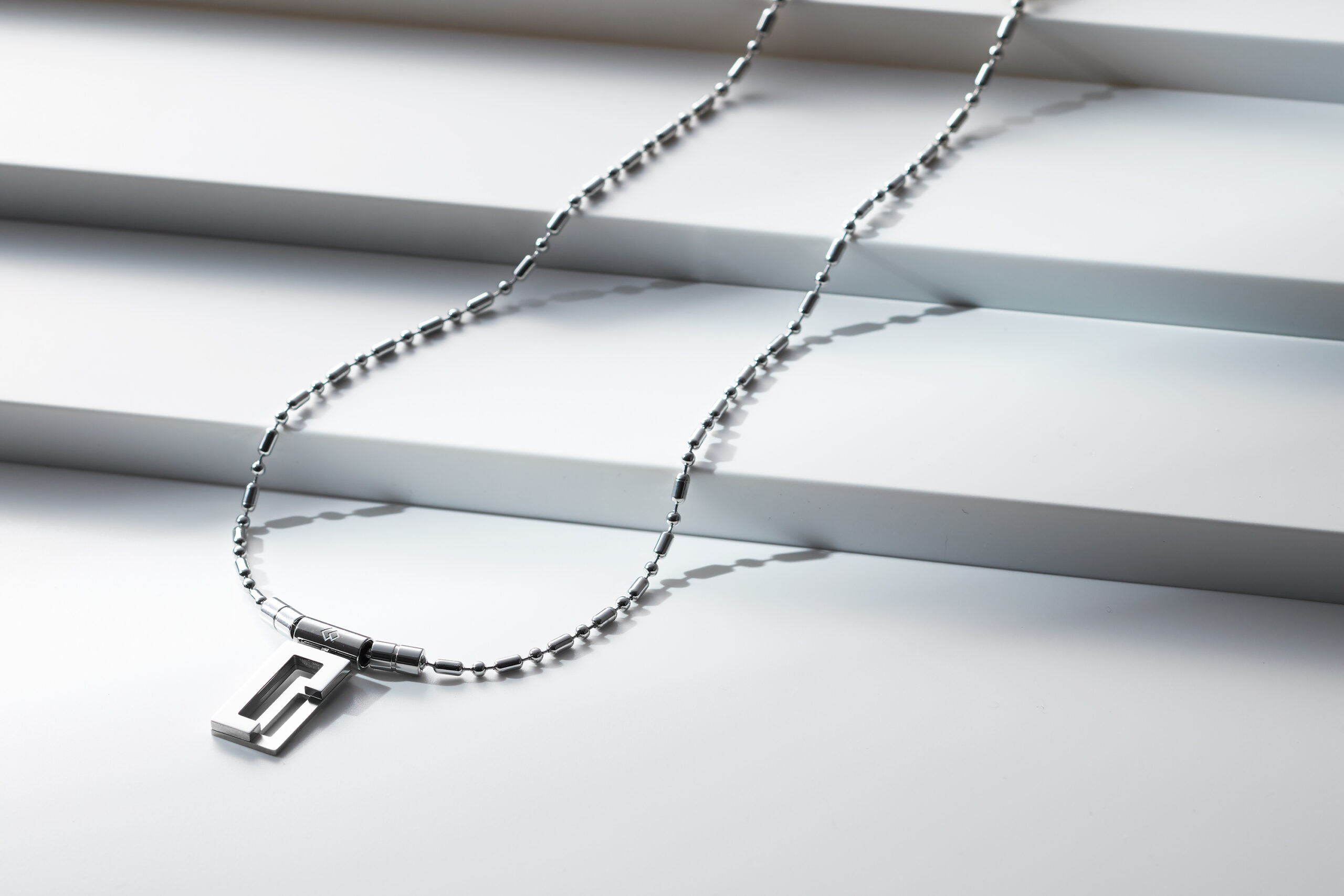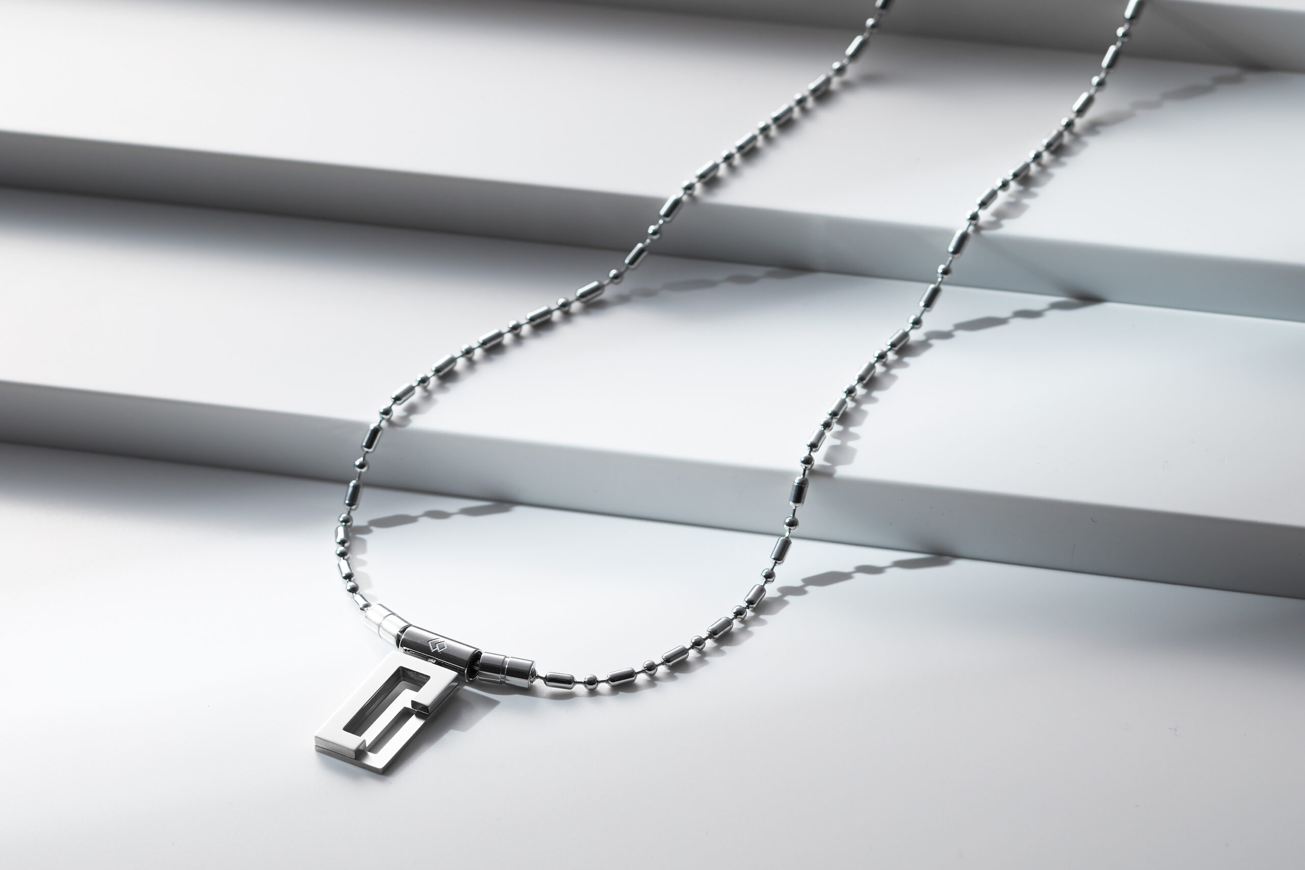 COA Necklace LECT” is a chain-type necklace which combines the ball-shaped parts and the bar-shaped parts. The pendant top is designed with “CO” motif and the two silver-coloured stainless steel plates are used for the parts. By mirror finishing the “C” portion, the pendant top looks solid and high-quality. This product was designed to be chic and stylish unlike the ordinary magnetic necklace.